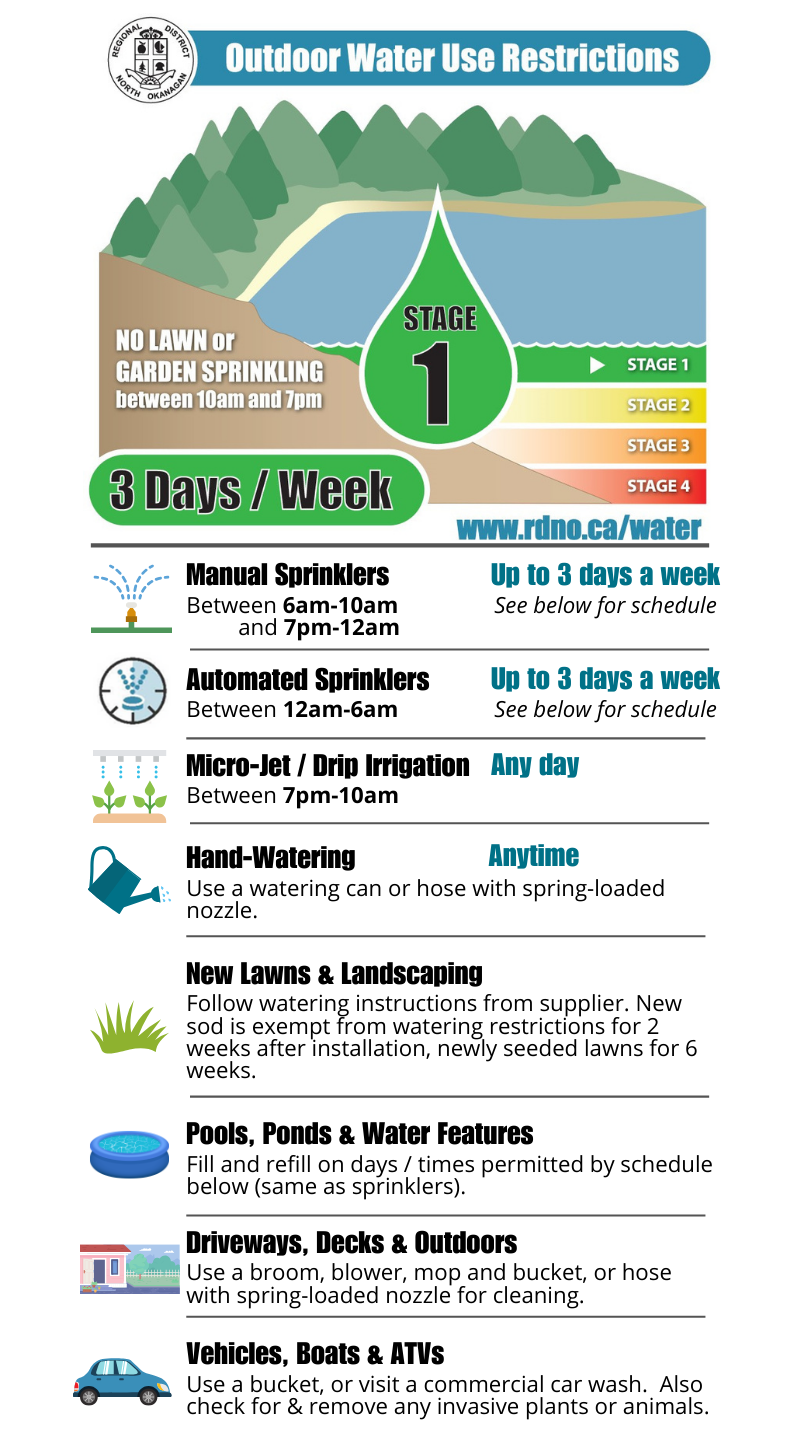 Visit the Water Conservation page for more tips on waterwise gardening and indoor water efficiency. Customers should note that a higher level of restrictions may be instituted due to drought or emergency. Details relating specifically to Greater Vernon Water's demand management programs can be found below:
