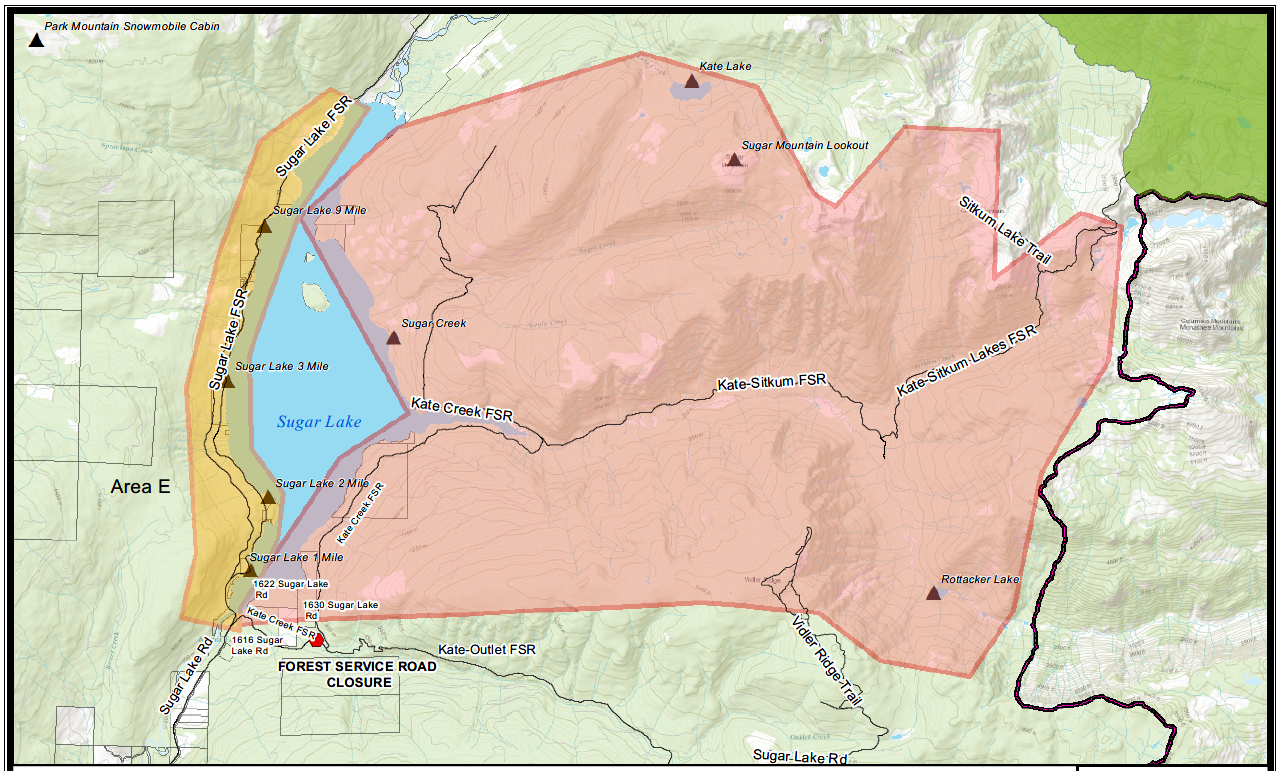 Based upon recommendation from the BC Wildfire Service, the Regional District of North Okanagan (RDNO) at the Emergency Operations Centre has issued an Evacuation ORDER for the east side of Sugar Lake, especially for the seasonal recreation properties within Sugar Lake Resort located at 1630 Sugar Lake Road due to the Sitkum Creek wildfire (#K41109), previously on alert.