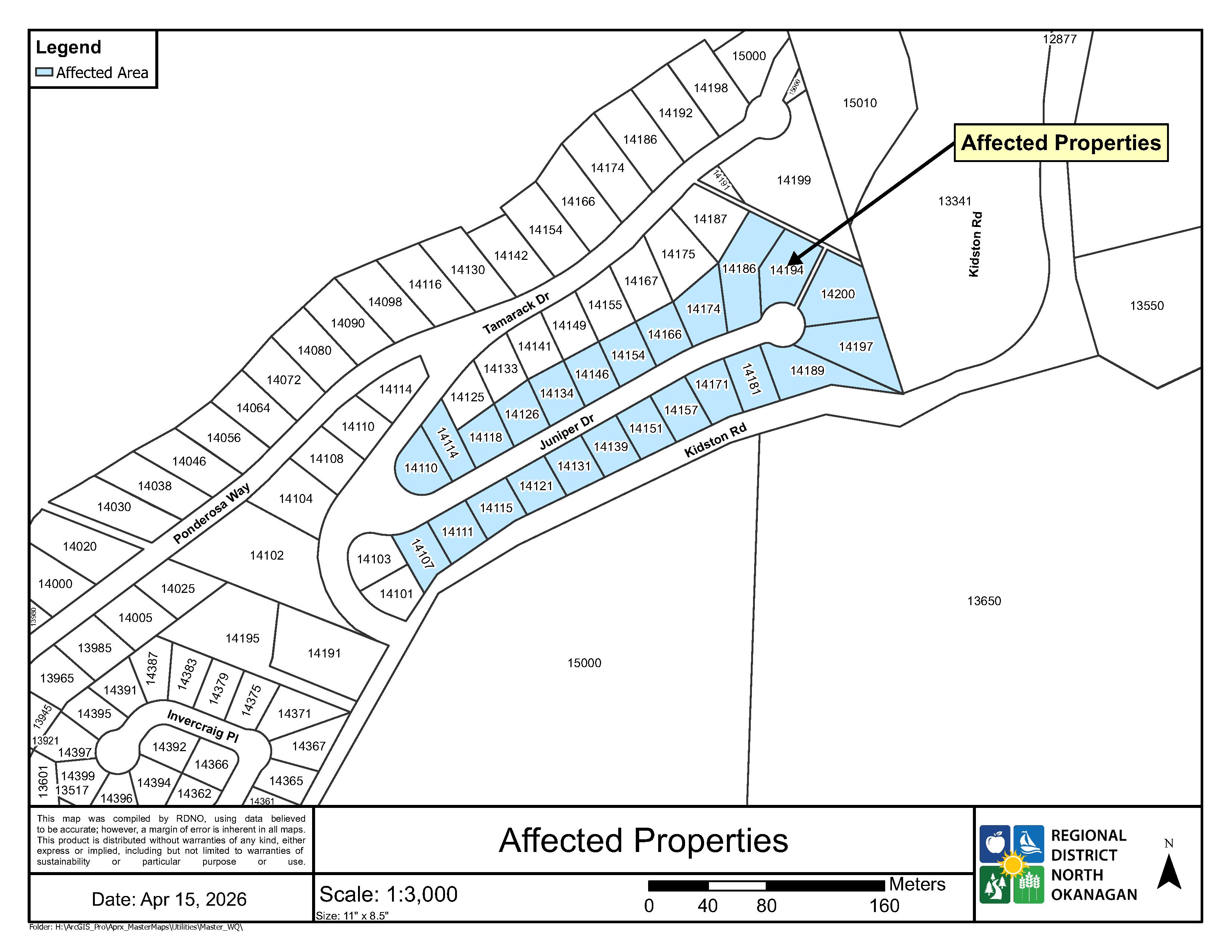 In conjunction with Interior Health, the Regional District of North Okanagan (RDNO) advises some customers supplied by Greater Vernon Water that they are on a precautionary Water Quality Advisory (WQA). The affected area includes 14107 – 14200 Juniper Dr (see map).