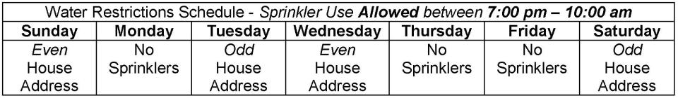 This means that residents are allowed to water their lawns and gardens outdoors using sprinklers, but only on two specific days each week, depending on your street address (schedule below). Staggering the days in which watering is allowed allows for a steady and sustainable draw on the system which is important to avoid adverse effects to the safety and availability of drinking water. And, as always, watering between 10 am and 7 pm is not allowed at any time.
