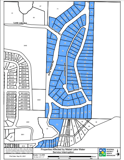 The Mabel Lake Water Utility (MLW) is informing customers that the water supply will be turned off to the Dolly Varden and Walker Road area from Monday, September 20 to Friday, September 24, 2021, and Monday, September 27 to Friday, October 1, 2021, for planned construction work. A map of the affected area is below.