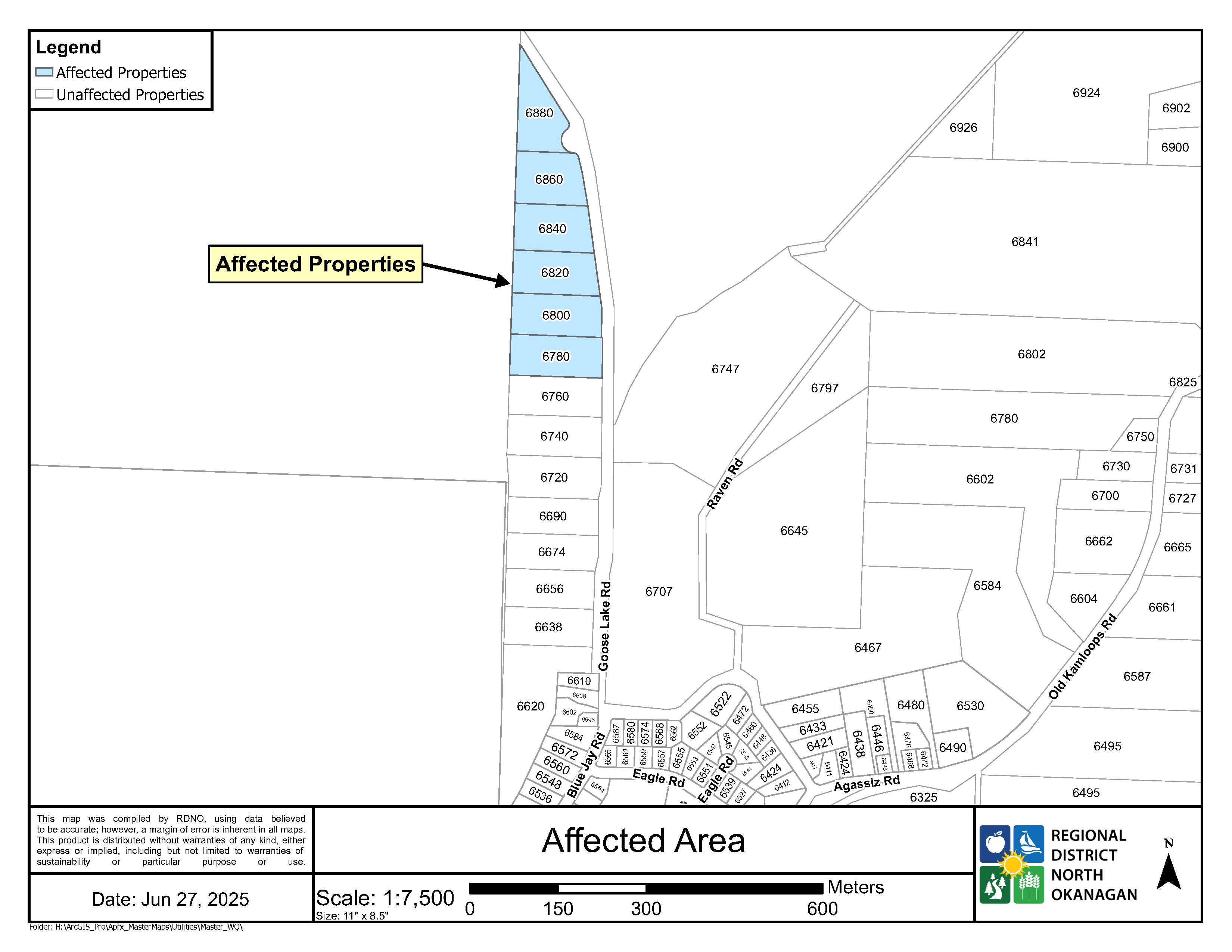 In conjunction with Interior Health, the Regional District of North Okanagan (RDNO) advises the above customers supplied by Greater Vernon Water that they are on a precautionary Water Quality Advisory (WQA) until sampling results confirm the drinking water is safe. The area affected includes 6780 to 6880 Goose Lake Road (see map).