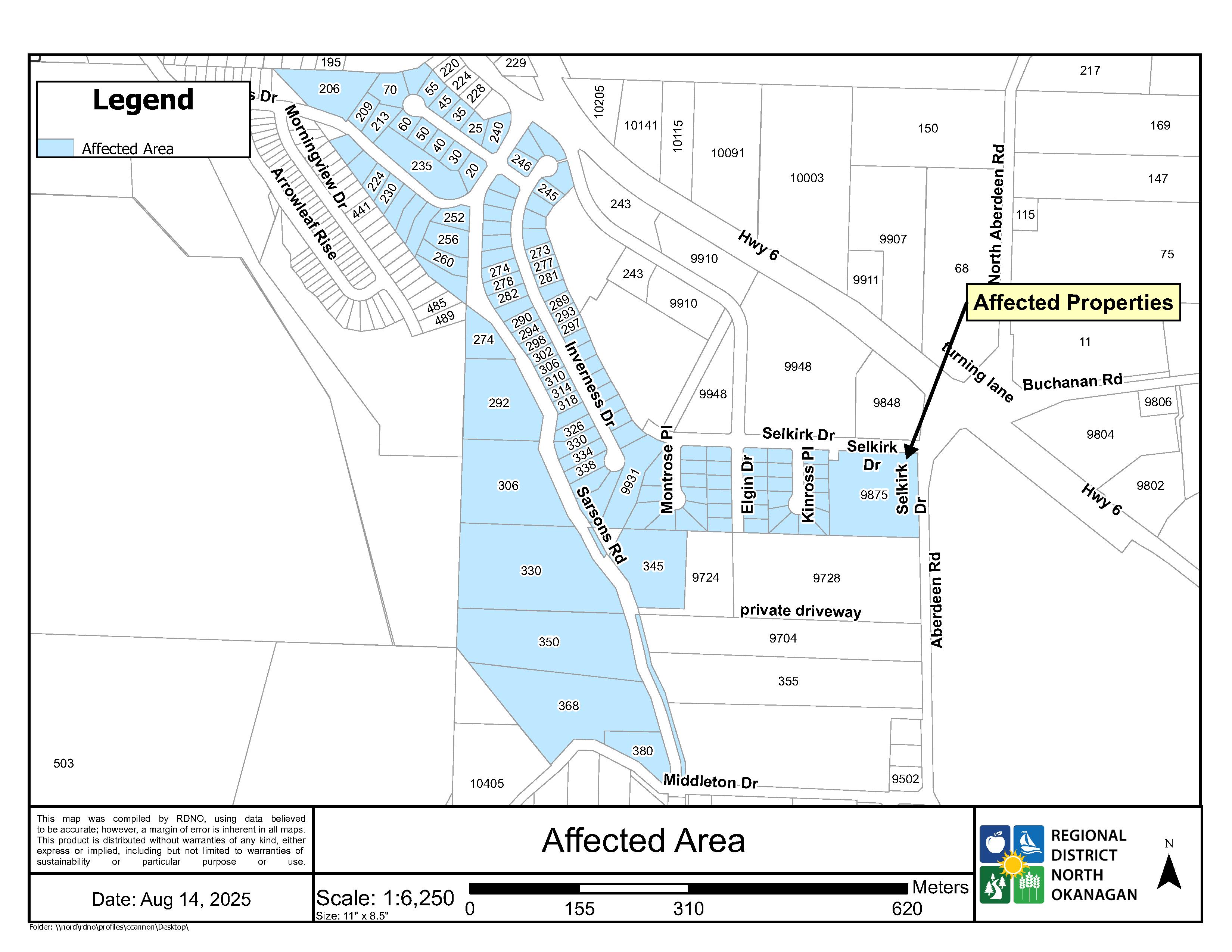 In conjunction with Interior Health, the Regional District of North Okanagan (RDNO) customers supplied by Greater Vernon Water that they are on a precautionary Water Quality Advisory (WQA). The area affected are properties along Selkirk Dr, Montrose Pl, Elgin Dr, Kinrose Pl, Inverness Dr, 209-248 Sarsons Dr, Sarsons Pl, and 240-380 Sarsons Rd (see map).
