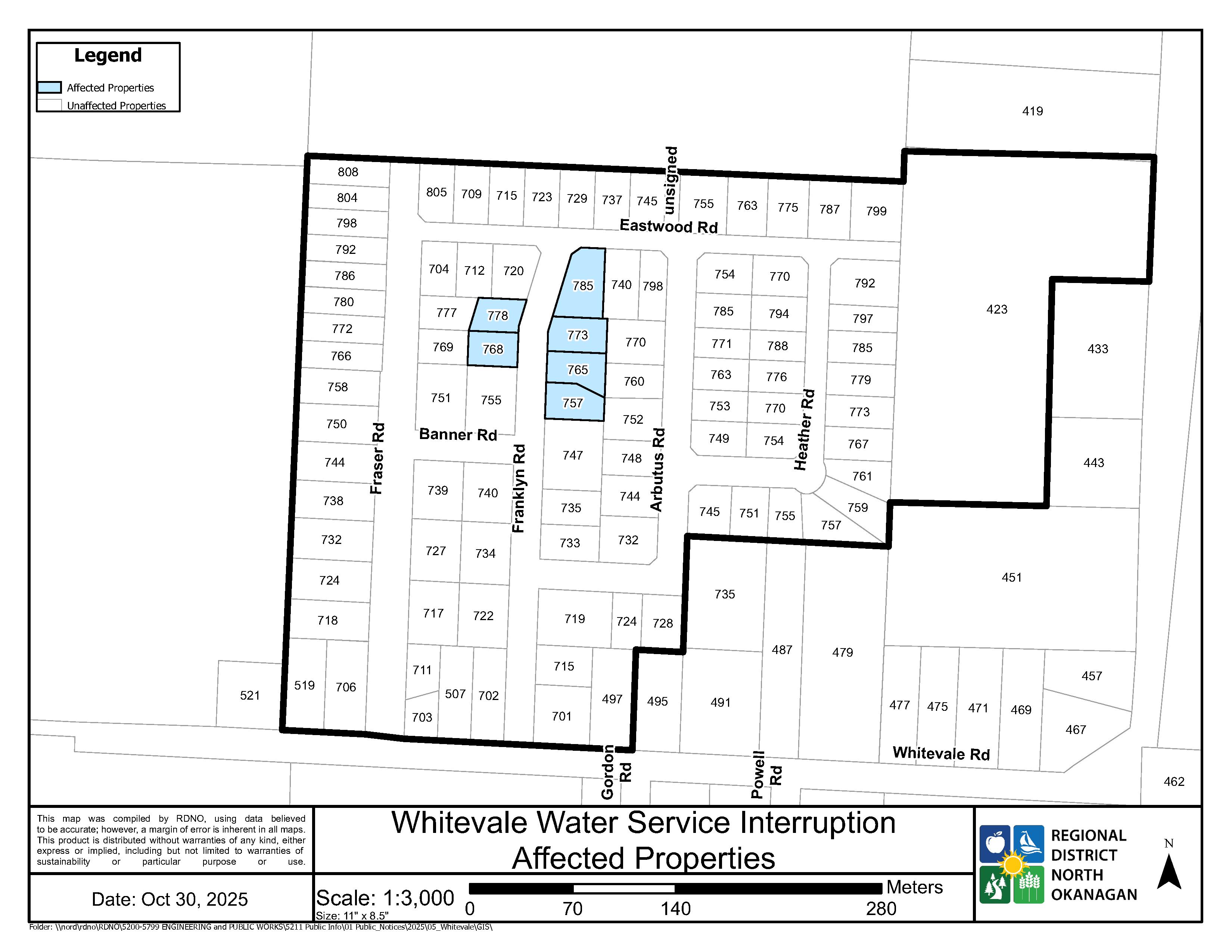 The Regional District of North Okanagan (RDNO), in conjunction with Interior Health, advises customers supplied by the Whitevale Water Utility (WVW) that on Thursday, October 30, 2025, there will be a water outage while planned construction work to install a fire hydrant on Franklyn Road is completed. Some customers on Franklyn Road will be placed on a Boil Water Notice (BWN) as a result of the work (see map of affected area).