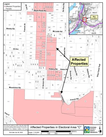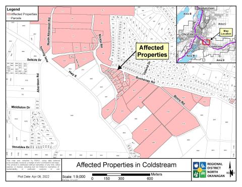 Greater Vernon Water (GVW) advises customers in the N Aberdeen, French, Pottery, E Vernon, Black Rock, Nickle, Buchanan and Binns Road areas (affected properties shown on attached maps) that a planned repair will take place on Monday, April 11, 2022 between 9:00 am - 4:00 pm and will impact water supply and quality. It is anticipated that the work will be completed during this time frame unless unforeseen circumstances arise which could extend this interruption. Properties on the maps will be out of water.
